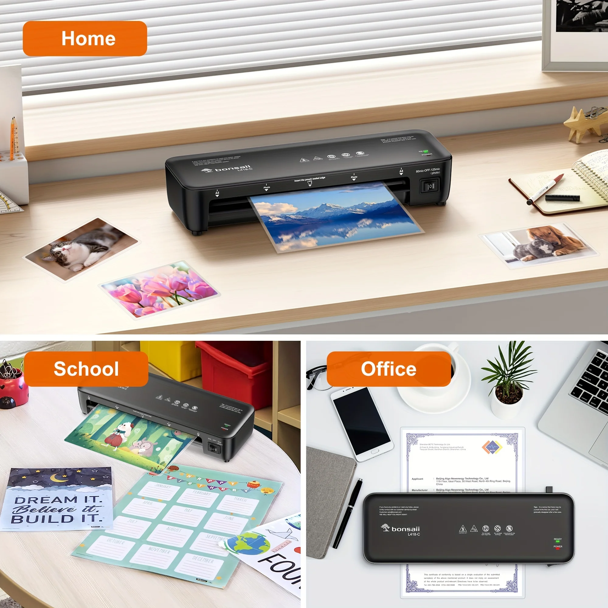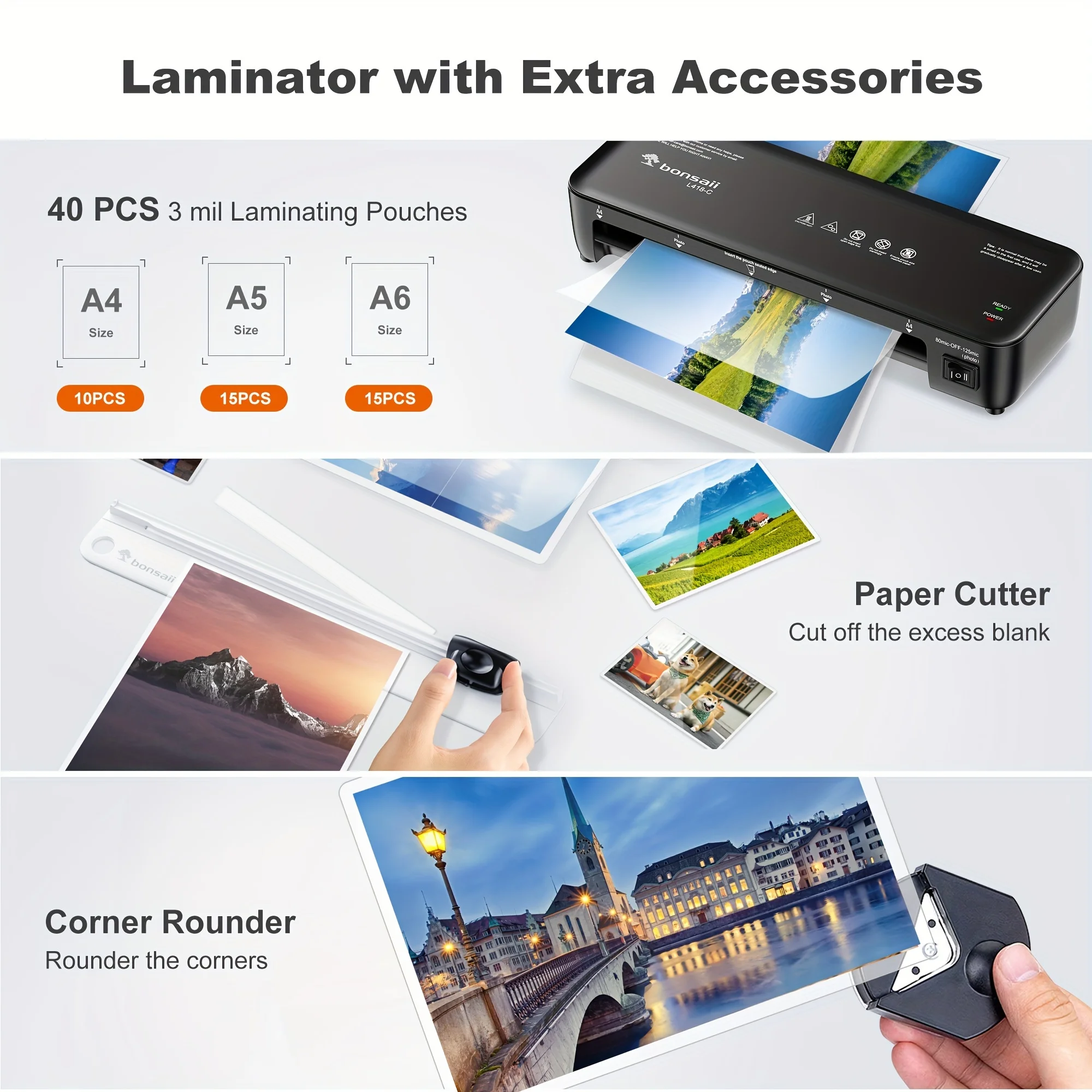 100% Jam-Free Laminator: eatures built-in patented jam-proof tech to prevent glue jams, safeguarding your items and ensuring efficient protection. 4-in-1 Laminator Kit: Includes Laminator, Paper Cutter, Corner Rounder, & 40 Laminating Pouches (10 Letter, 15 A5, 15 A6). Preheats in 3 mins, laminates at ≥270mm/min for rapid, quiet operation. Compact & Versatile: ccommodates A4 paper, fits 3-5 mil pouches, and measures 13.07"L x 4.41"W x 2.44"H. Perfect for home, office, & school. Ideal for All Settings: Simple to use, great for teachers, professionals, & more. Preserves docs, photos (training materials, legal docs, posters, menus, artwork). Tips: Initial use may have a slight odor which diminishes with use (safe, heated pouch smell). Use 3 mil for standard paper, 5 mil for thicker items (photos, biz cards).